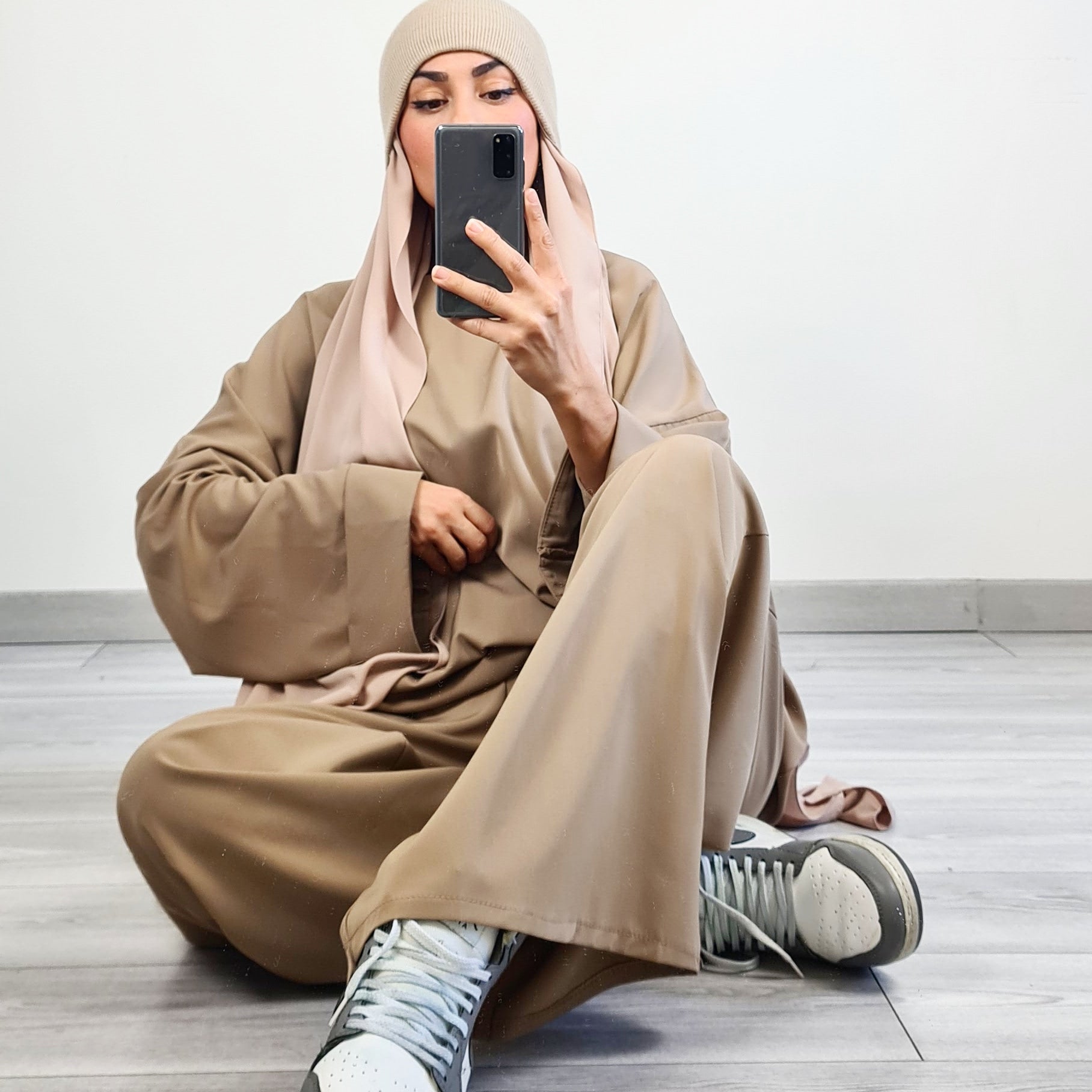 Ensemble tunique et pantalon taupe tissu façon crêpe (polyester et élasthanne).